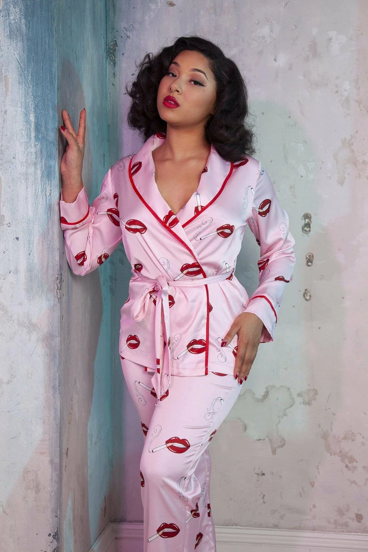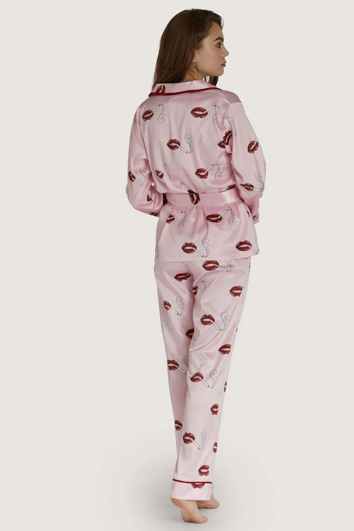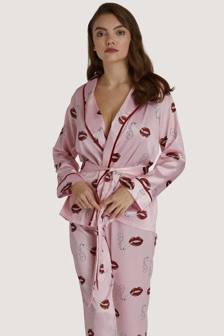 Kisses all over! The Lip printed PJ set features ravishing red lips smoking a cigarette over hot pink, with contrasting piping. The top wraps around the body with a satin tie, and the trousers are loosely fitting.