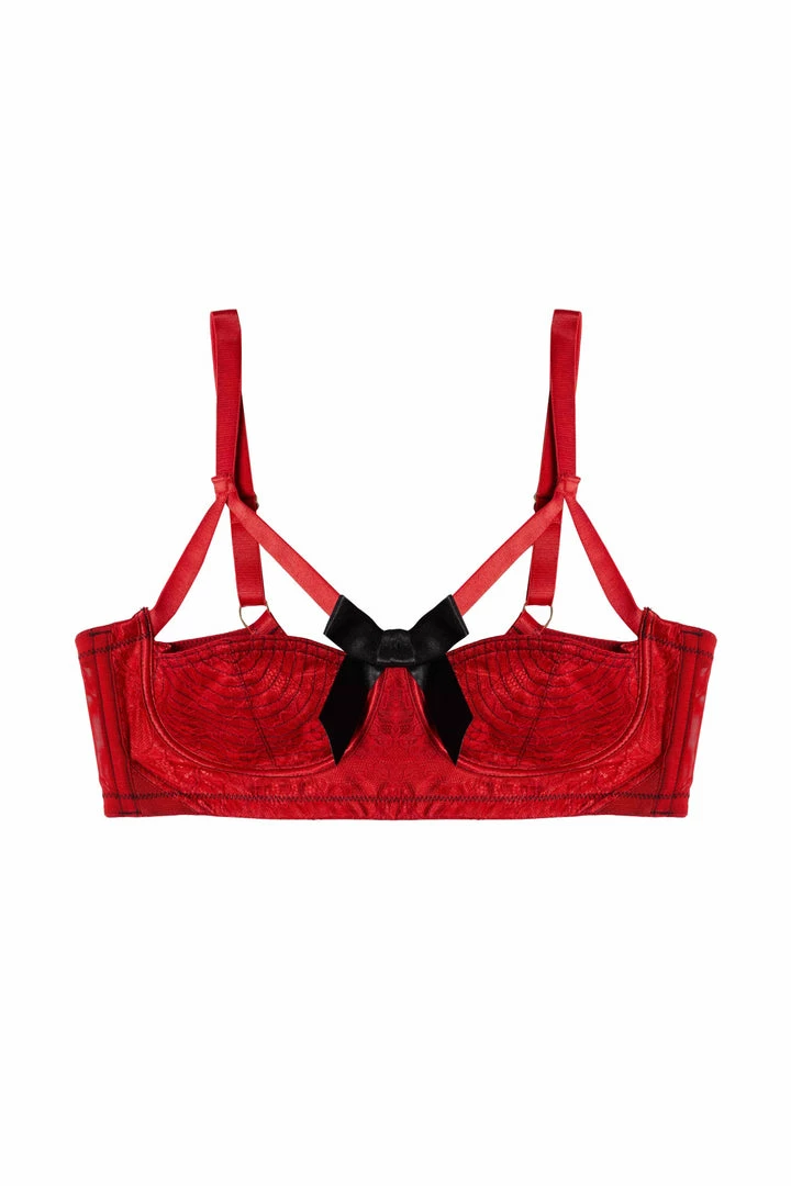 A classic vintage shape – this ¼ cup creates a cheeky point without the need for a bullet bra. Perfect to wear with nipple pasties. In sexy red satin and black bow detailing for extra va va voom. The straps create a triangle harness effect before slipping over the shoulder to the back.