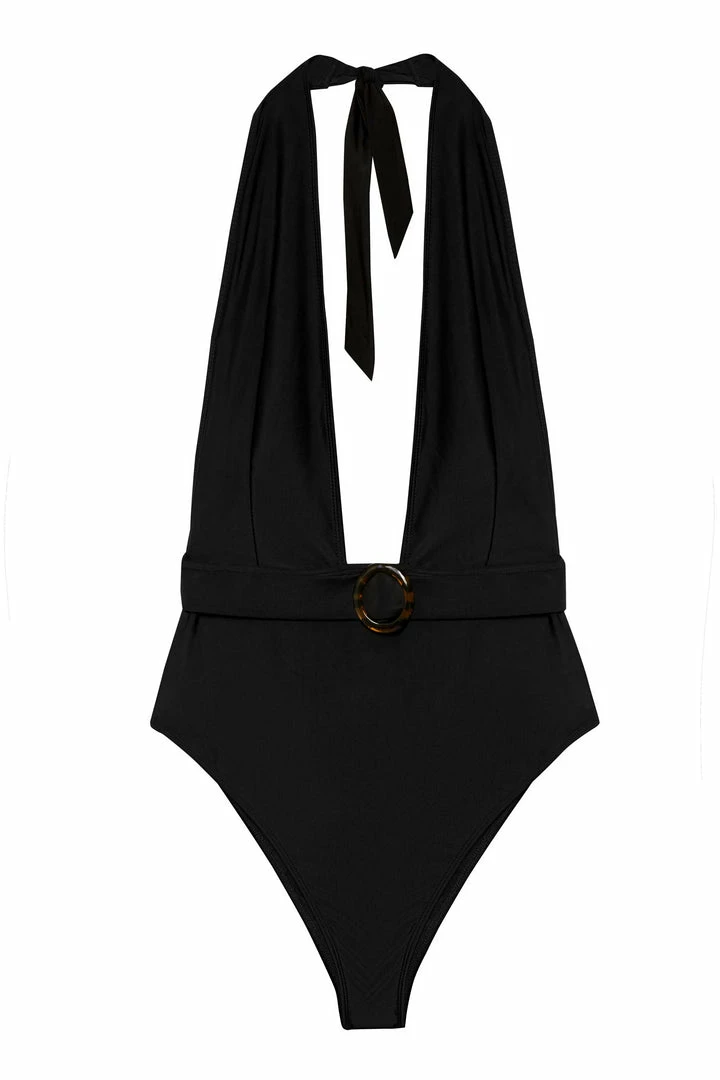 Sun, sea and the swimsuit of dreams, this 50s inspired black swimsuit has that perfect vintage pin-up vibe. The Bettie Page swimwear collection is designed to accentuate your curves with classic silhouettes. The Jayne swimsuit features a flattering halter neck design and tortoise shell belt.