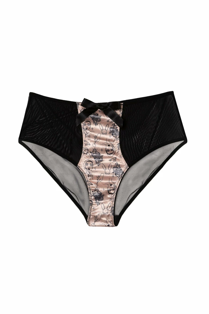 Transform yourself into a Pinup Queen in our Bettie Page Tattoo lingerie set. The Tattoo High Waisted Brief features a soft pink satin panel with a tattoo design including snakes, florals, and pretty silhouettes with black mesh panelled hips and a black satin bow detail. The illustration was designed by tattooist Safeword by Sophie. You can match with the Bettie Page Tattoo Bra, Girdle or Suspender Belt for the full set.