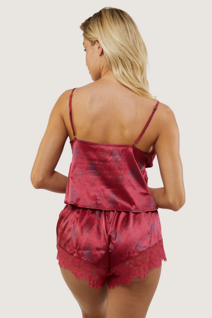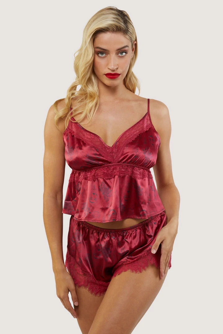 Transform yourself into a Pinup Queen in our Bettie Page Tattoo Print Cami and Short Set. This beautiful set is constructed from soft red satin with a tattoo design including snakes, florals, and pretty silhouettes, it also features delicate red lace details and pretty black bows. The illustration was designed by tattooist Safeword by Sophie.