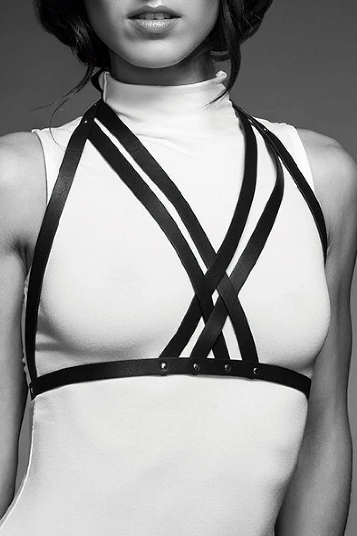 This harness frames your breast and cleavage. Try it over a sheer top with pasties revealing just a little bit of it of skin. The perfect style to let out your flirtatious side.