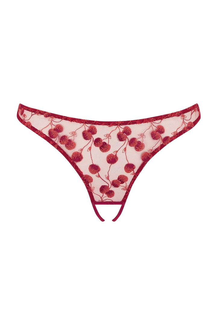 Coco de Mer’s playful ‘Naomi’ open knickers are made from barely-there tulle that’s intricately embroidered with a cherry pattern. This pair has a cheeky cutout and is finished with a bow . Complete the set with the matching bra.