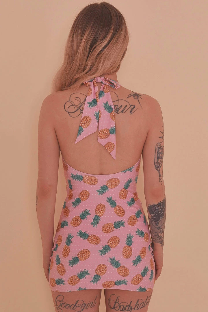 The Pineapple print skirted halterneck swimsuit is here to give you totally tropical vibes. With a baby pink background, it’s the Malibu dream.