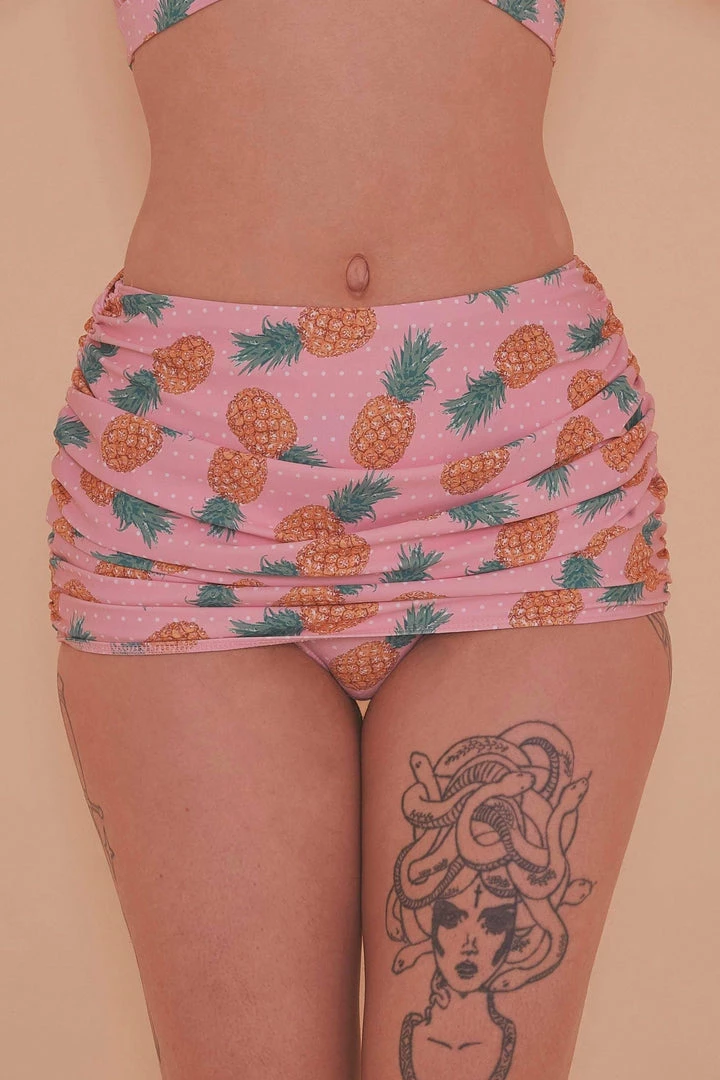 The Pineapple print skirted bikini brief is here to give you totally tropical vibes. With a baby pink background, it’s the Malibu dream.