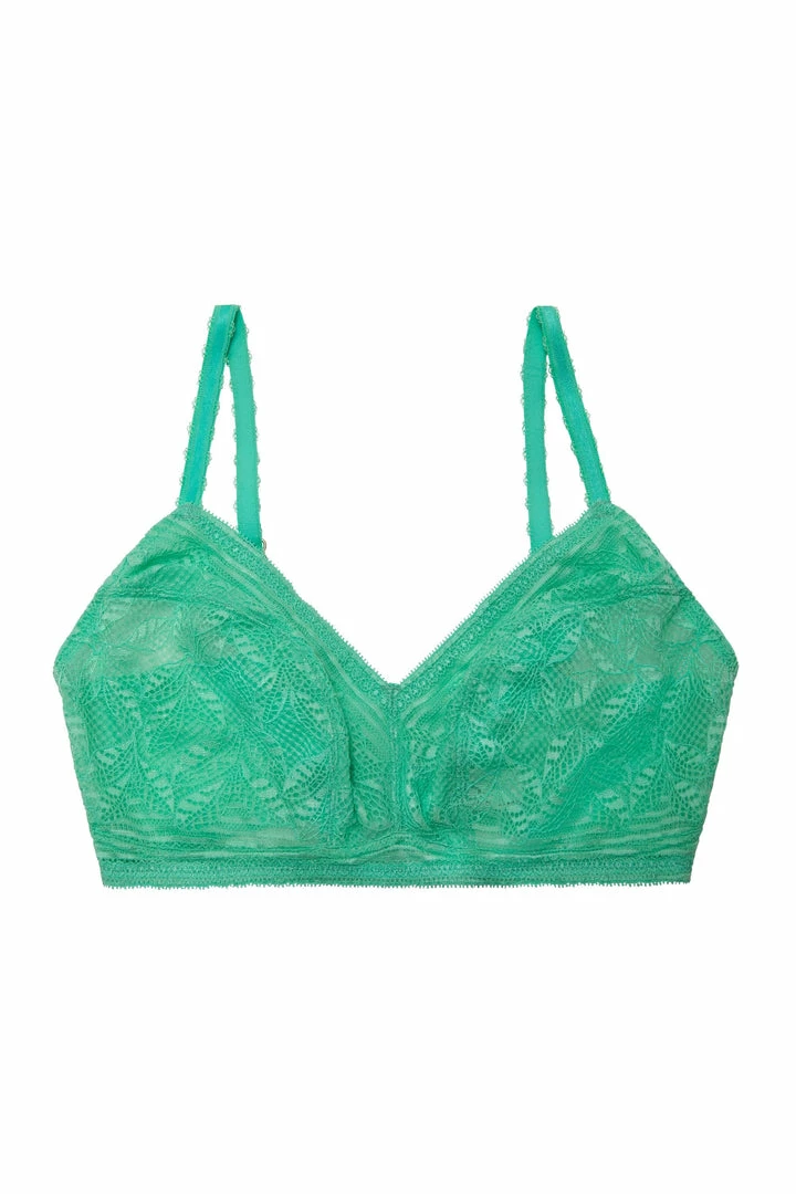 The Emma bra is the ultimate comfort for every day. With no underwire, soft lace and a supportive mesh lining, this bra is designed to support by hugging your curves. The perfect everyday bra for your everyday lingerie collection. Shown here in the Green colourway.