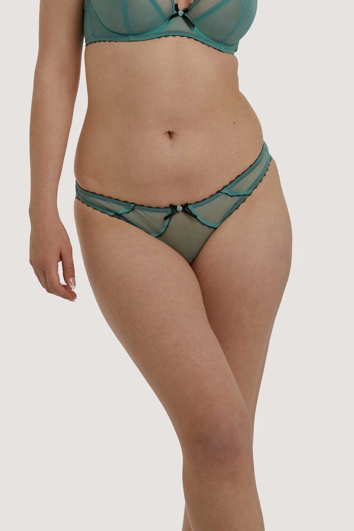 The Grace brief is an everyday mesh panel brief with pretty detailing. This mesh brief is comfortable and flattering with its mesh panels and pretty bow front. It’s the perfect balance between practical and sexy without trying too hard. Shown here in our Moss and Black colourway.