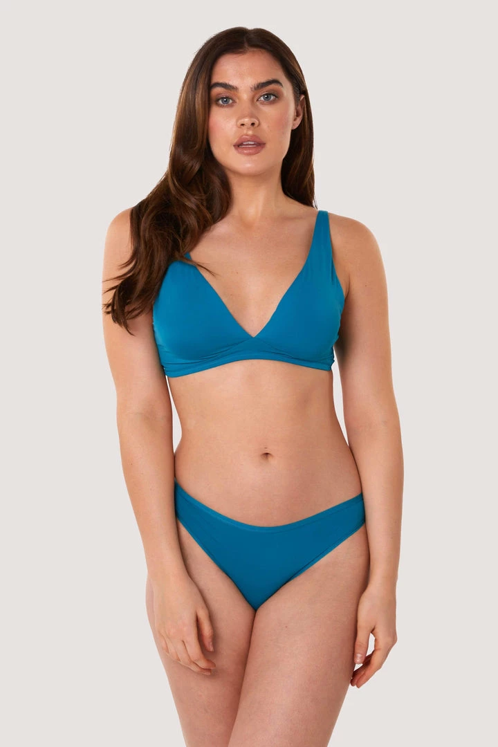 Treat your skin to the recycled Teal Triangle Bra. This bra features moulded and seam free cups that that will provide a clean, smooth. second skin look. Carefully sculpted, this bra will keep to your natural silhouette and provide support at the same time – making it the perfect unseen bra for almost any activity.