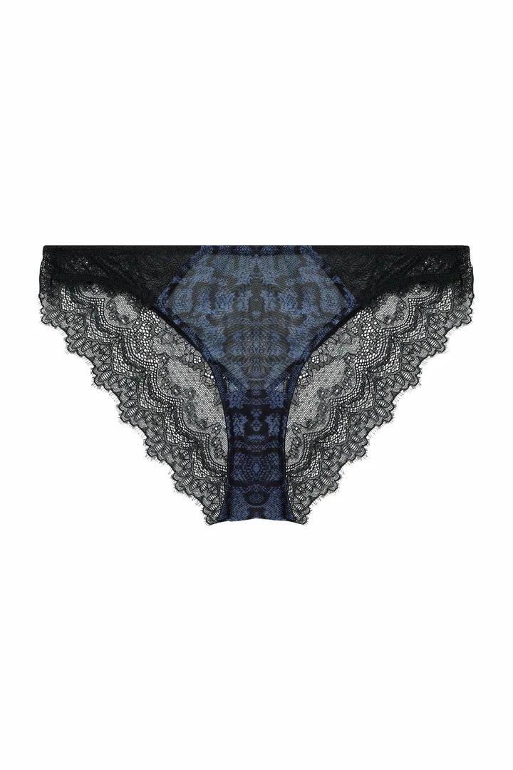 - Sheer mesh snake print brazilian briefs with black lace detailing
