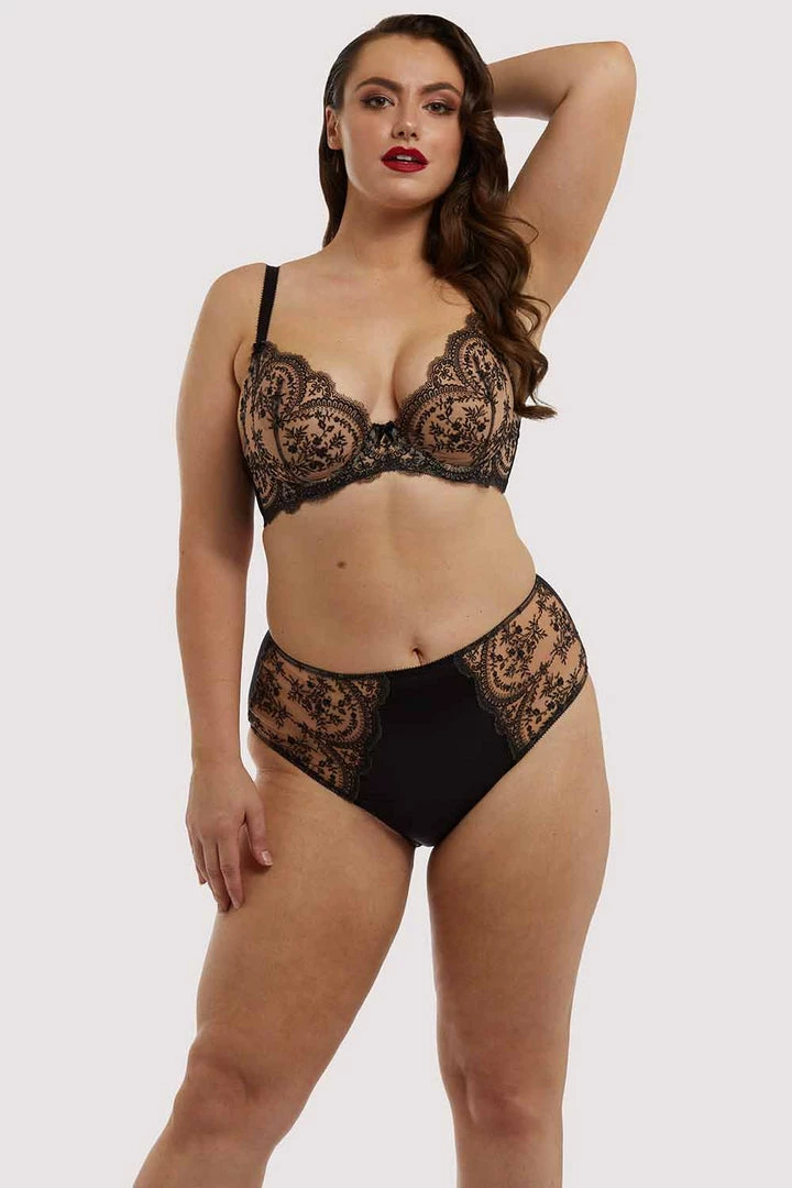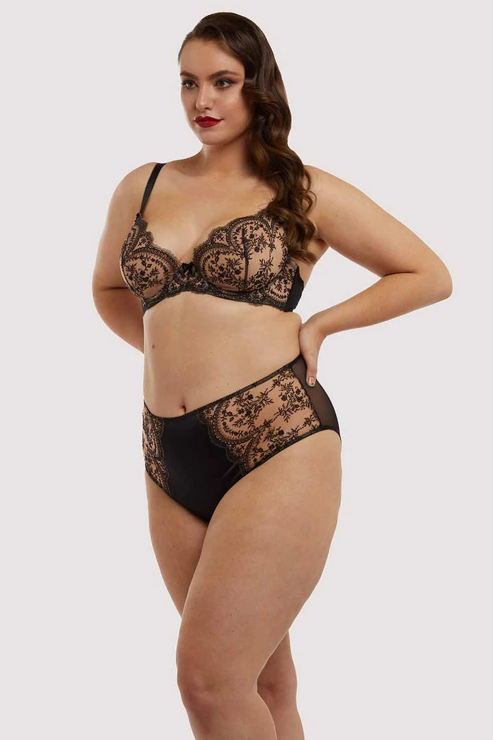 Dita Von Teese Lingerie plus sizes are exclusively available at Playful Promises. Dita created Severine combining her love of black detailing on nude tones. The black embroidery is dramatic against the nude soft mesh. Easy to wear, beautiful lingerie. The bra is a sheer cup bra with soft subtle lift from the unique satin petal inserts.