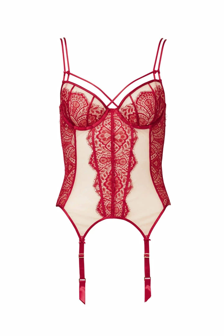 The bustier is elegant and sexy with a dramatic fetish feel from the strap detailing and the hints of nude mesh under lace. Made from exquisite European Leavers lace and super fine mesh this bustier is a collector’s piece and truly designer lingerie. The lace panels in the front of the bustier are designed to flatter a figure.