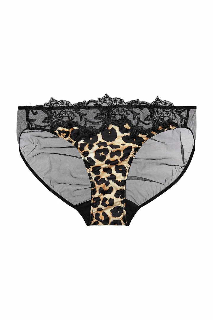 The Millicent Bikini is made animal print on a soft stretch satin with black embroidery and a soft stretch mesh back.