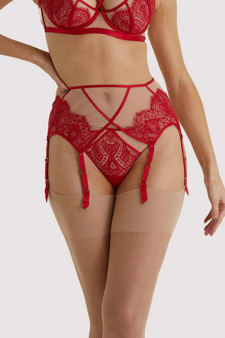 The suspender is vintage inspired with a wide front panel which features lavish use of the Leavers lace over superfine light peach mesh and strap details across the front. The suspender has 6 garter attachments to ensure the stockings are always sitting secure and stable.