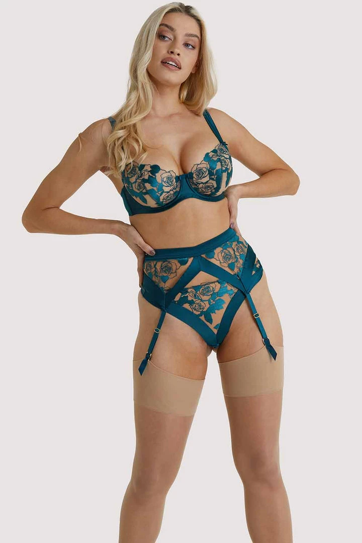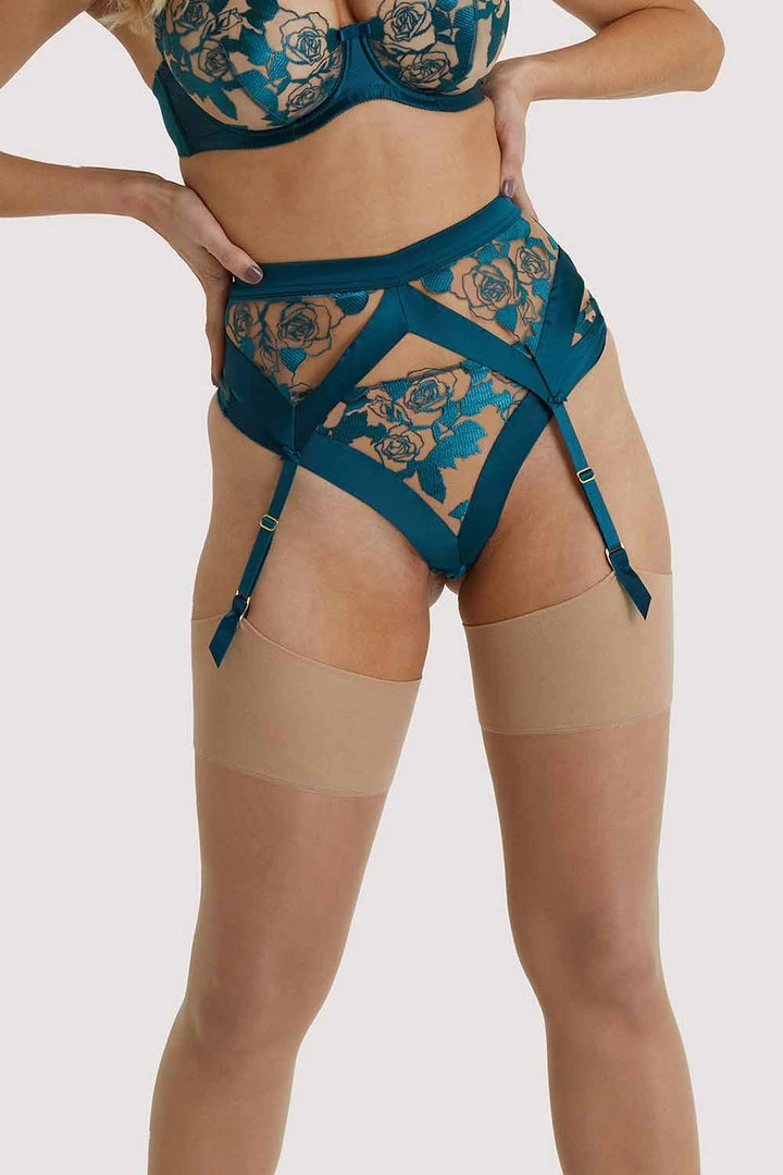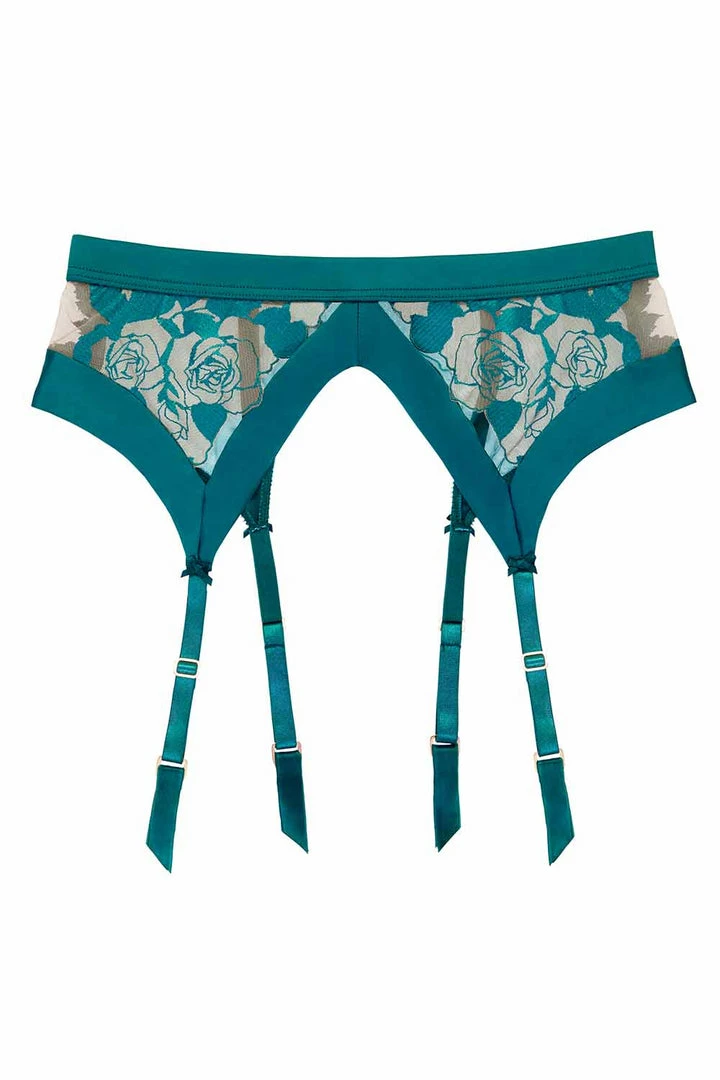 Rosy in Rosabelle! This unique lace and sheer mesh illusion set are as good as wearing a bouquet of roses! Aquamarine teal satin makes up the base of this set, with a contrasting vintage floral pattern.