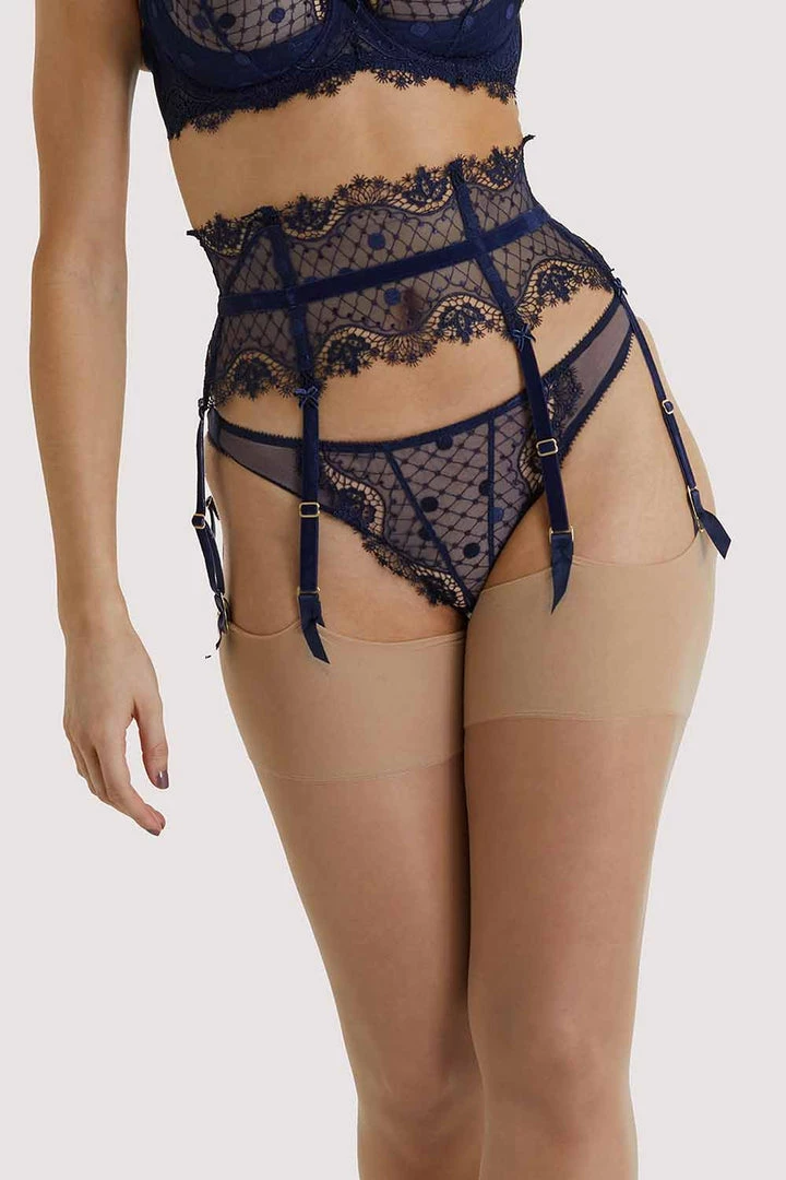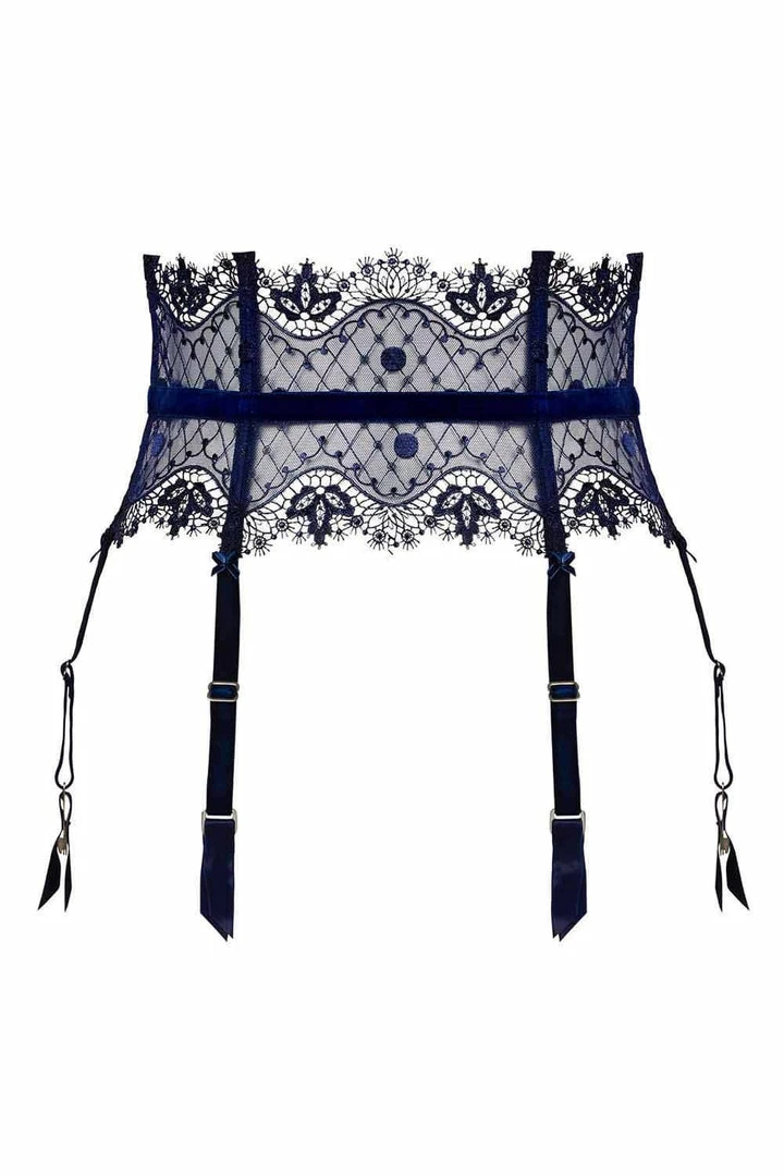 Vedette features beautiful detailed embroidery with fine stretch mesh. The suspender features a wide embroidered front that sits high at the waist. The suspender had 6 velvet garters for stability and function. This is a must for lingerie lovers.