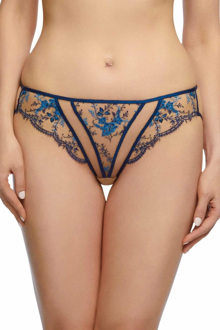 Dita created Femmoiselle combining her love of embroidered detailing on sheer tones. The two tone blue floral embroidery has lurex highlights and is delicate on the soft sheer mesh. Dita has playfully added her stiletto into the design. Can you find it? The Femmoiselle Bikini has an embroidered front and sheer mesh back with heirloom sapphire trinket.