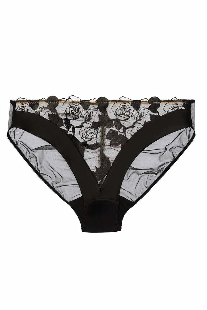 The Rosabelle Bikini features a dramatic bold ros embroidery on a nude tulle. Trimmed with satin banding and features a stretch mesh back.