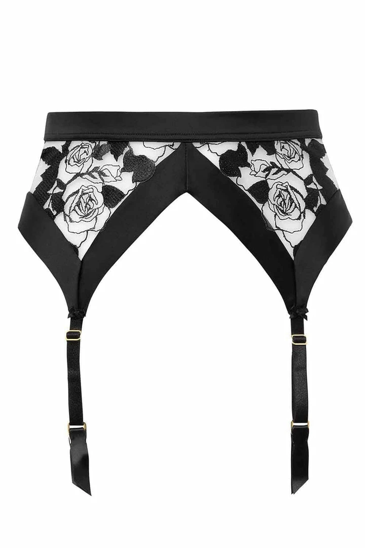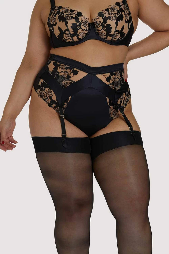 Dita Von Teese Lingerie plus sizes are exclusively available at Playful Promises. The Rosabelle Suspender features a dramatic rose embroidery on light nude tulle with satin banding detail. This suspender has 4 garter attachments for stability and peek a boo cut outs.