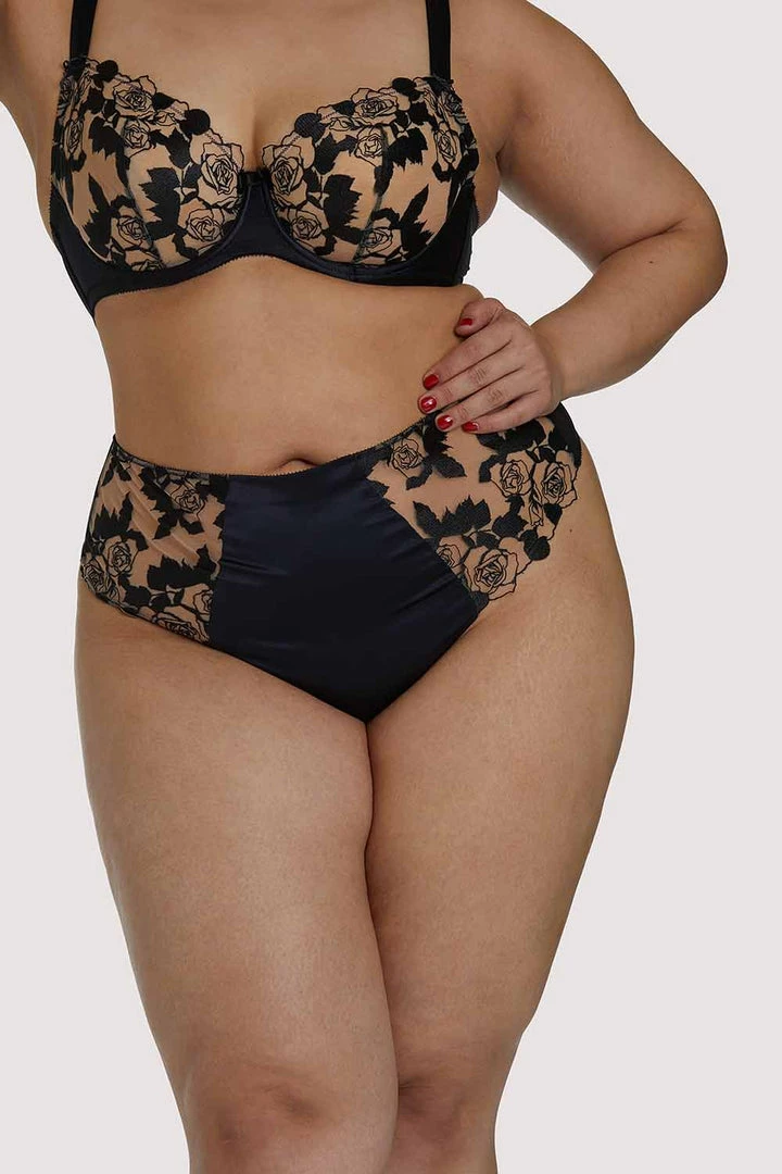 Dita Von Teese Lingerie plus sizes are exclusively available at Playful Promises. The Rosabelle High Waist Thong features a dramatic bold rose embroidery on a light nude tulle. Trimmed with satin banding and features a thong back.