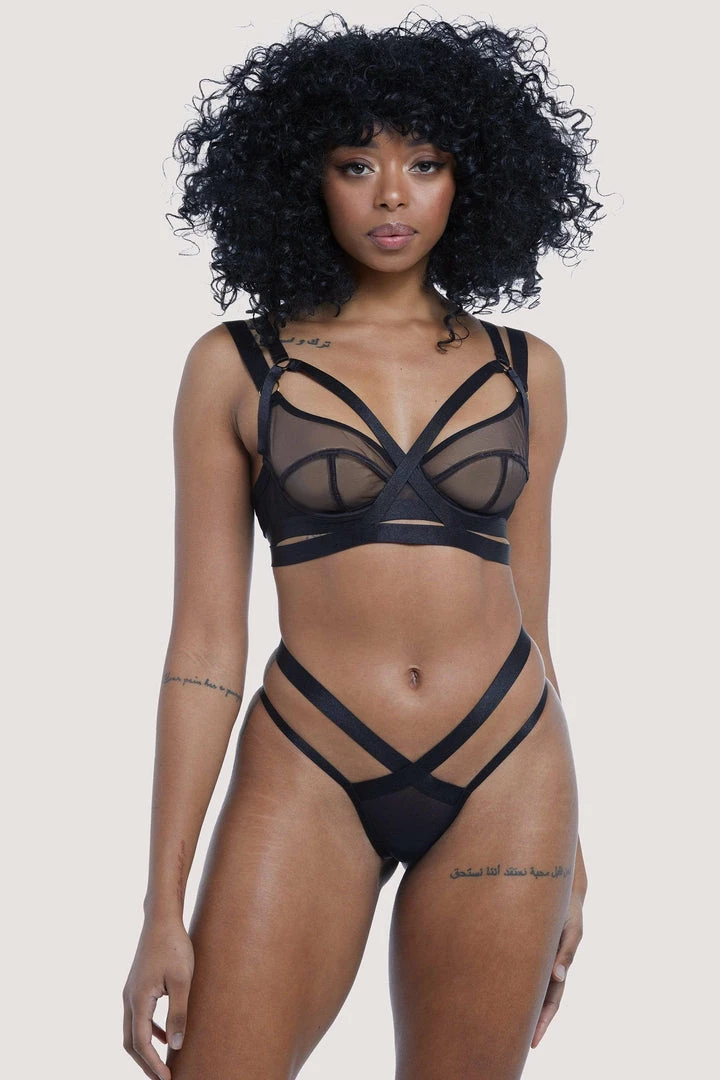 A step towards the dark side, this harness-laden set is bound to get hearts racing! Sheer black net is contrasted with black satin elastic straps that adorn the hips and waist. The sheer mesh shows a little peek of whats beneath!
