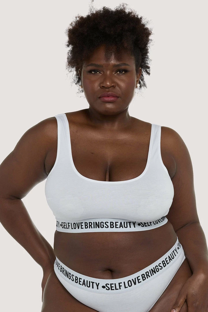 Made for pure comfort and everyday use, the Self Love sports set is adorned with Felicity’s championing statement ‘Self Love Brings Beauty’ to keep you going through those hard times. Made from a delicate soft cotton, it’s the go to for any activity, whether it’s a coffee date or a Netflix date. The bra has a low scooped neck line and thick supportive built in straps.