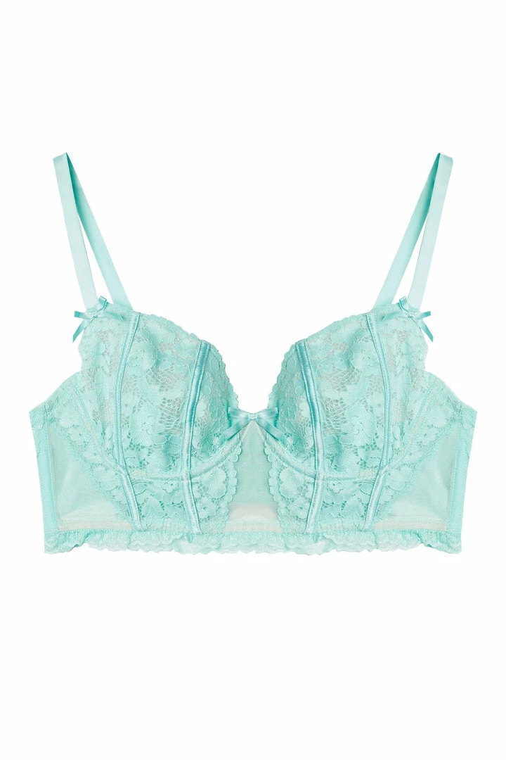 Introducing another exciting collaboration with UK model and body positive activist, Felicity Hayward! A frilly lace dream. This mermaid aqua coloured longline bra features stunning lace and gorgeous satin piping. Pair with one of the matching open back briefs for a jaw dropping look.