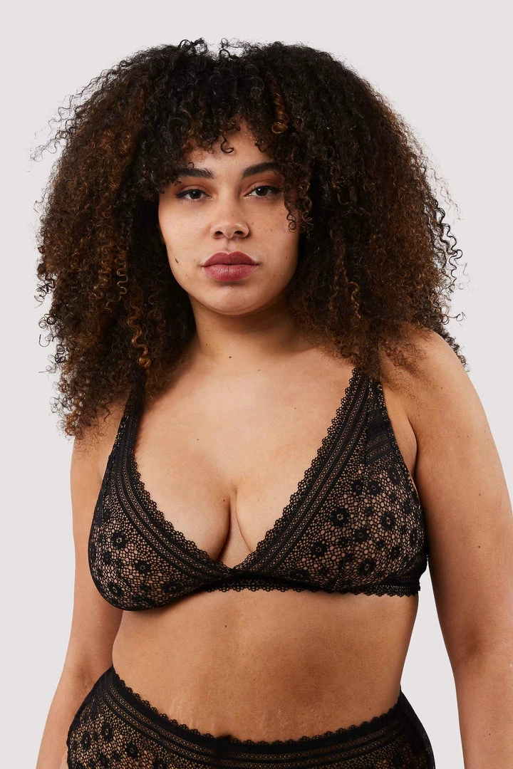 Cute and Comfy. Our Black Lace Crop Bralette is perfect for everyday wear, made from comfy floral lace this bralette will be a staple in your lingerie collection. Match with our Black High Waisted Lace Thong for the full look.