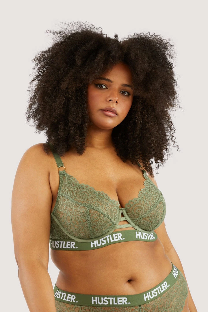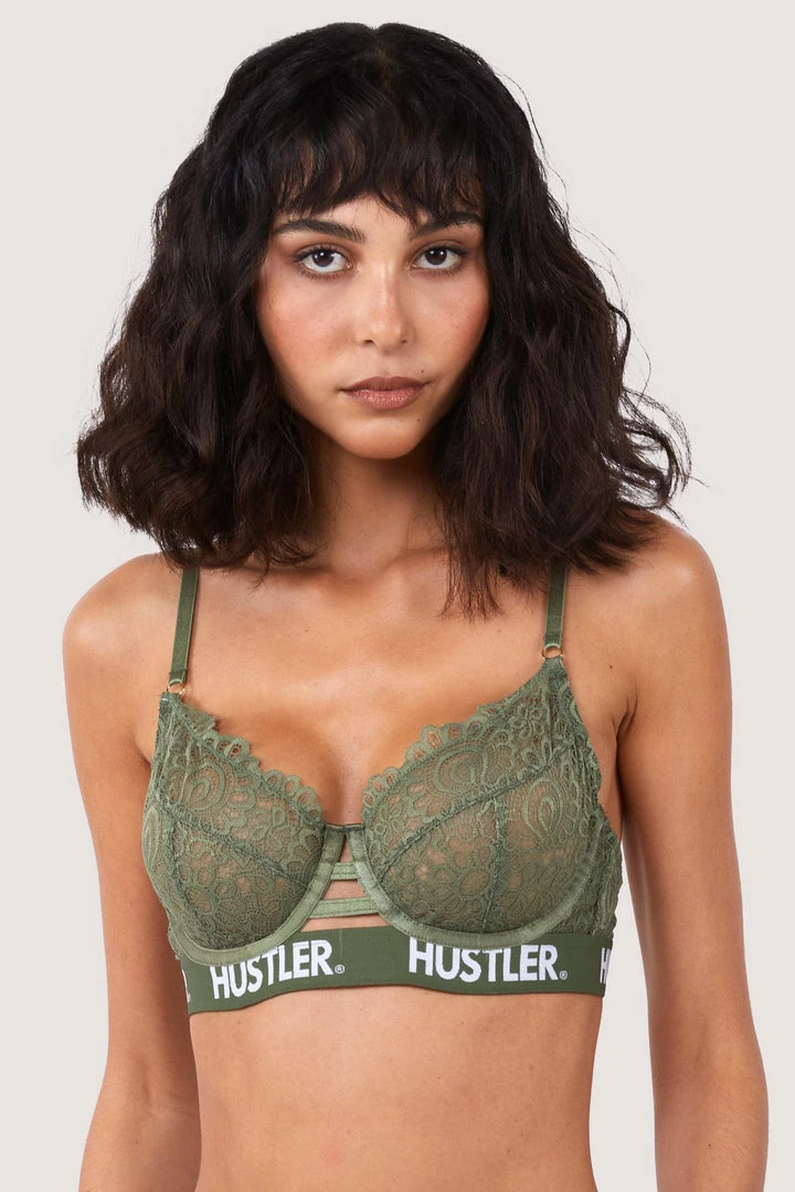 Feel heavenly in our Olive Hustler branded Lace Bra. Made with flirty floral lace cups which are finished with an elastic band of Hustler branding to give it a preppy look! Pair it with the matching Lace Brief or Thong for the full finish.