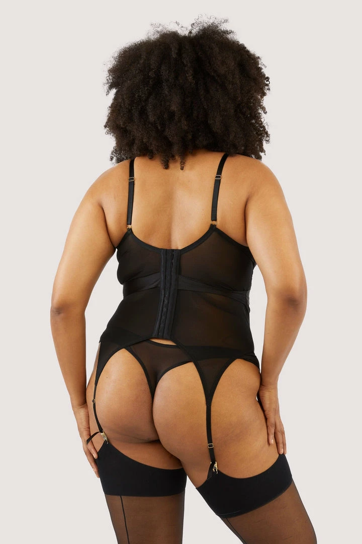 Have you ever seen a more inviting basque than Fabrice? Her soft fluttery lace placed strategically around a mesh centre panel to contour your silhouette. All perfectly finished with a bow tie around the middle. Match her with the Fabrice Lace and Mesh Thong for an ultra flirty feminine finished look.