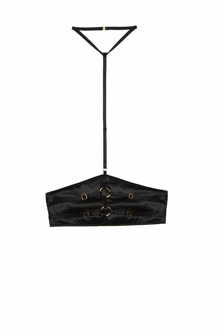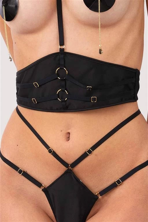 Get strapped up in our Sylvia Black Satin Harness Strap Detail Waspie. Featuring gold ring details and a harness neck detail for extra sexiness, this waspie is perfect for you. Match with the Sylvia thong for the full finish.