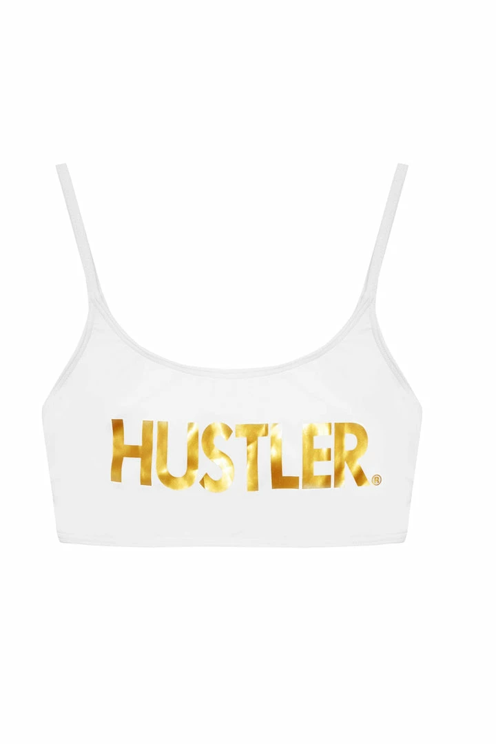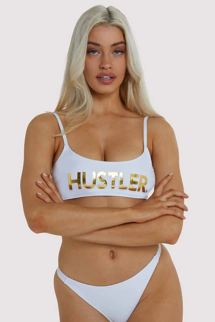 You can’t go wrong with a white bikini, featuring a gold Hustler Logo and a scoop neckline. Complete the look with the matching bikini bottom.