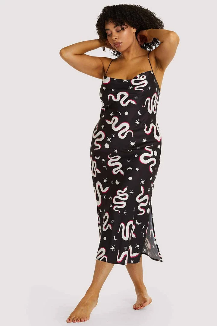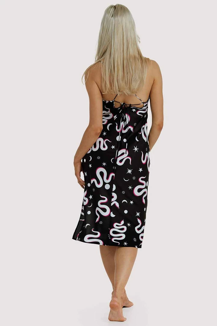 Feel sexy all night long in the perfect slip dress. Relaxed fit to flatter your curves with side leg split. Digitally printed in a bold design with tie back detailing.