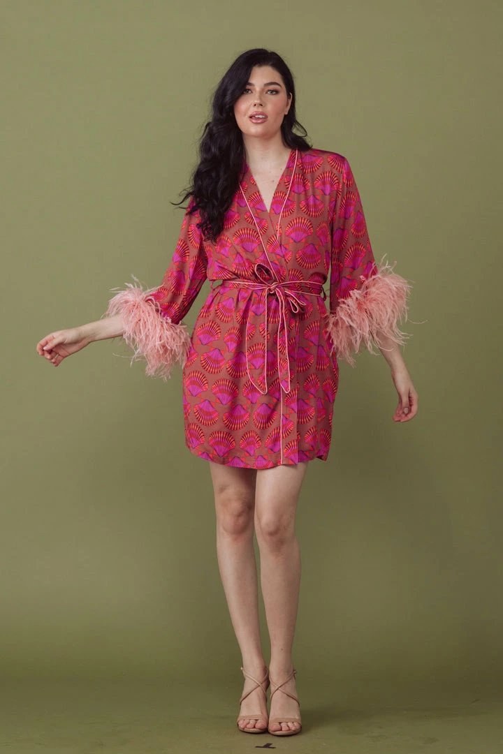 Embody elegance, comfort and style in this Kilo Brava robe. Combining a gorgeous shell print and pink feather detailÂ