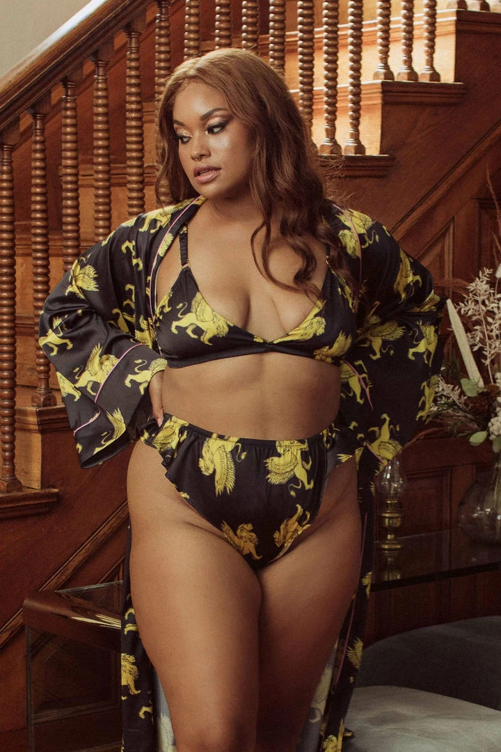 Digitally printed satin charmeuse bralette with beautiful neckline. Pair with the flutter panty for the sweetest set ever. Printed with Kilo Brava’s exclusive hand painted Lioness print.