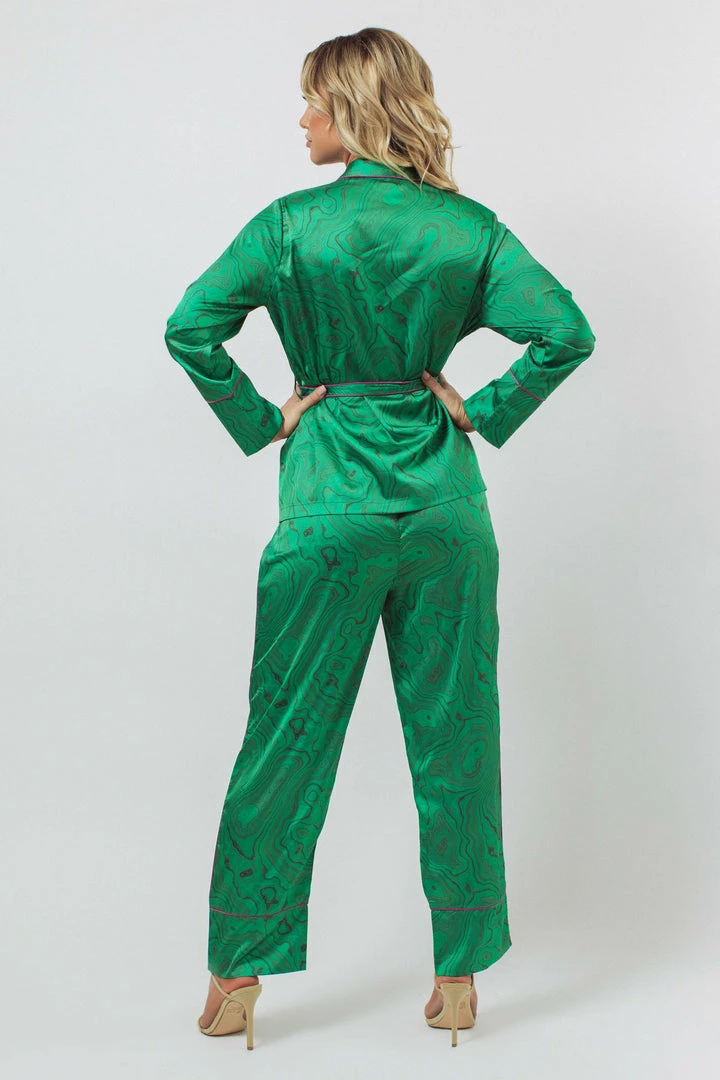 The Wrap PJ set. Made with the same tried and true pants from our classic set, but paired with a wrap jacket that can be worn in or out. Hello Versatility! Contrast piping, Self belted tie. Buttons at front opening. Shawl collar. Pockets on top and pants. Digitally printed and eco friendly with a stunning emerald green Malachite print with a pop of orchid piping.