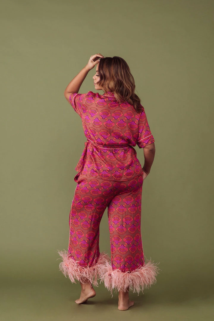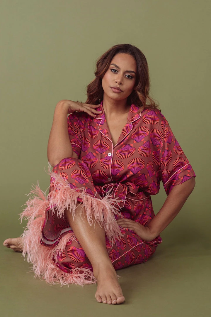 Embody elegance, comfort and style in this Kilo Brava nightwear set. Combining a gorgeous shell print and pink feather detail creating a dynamic, textured look. What’s not to love?