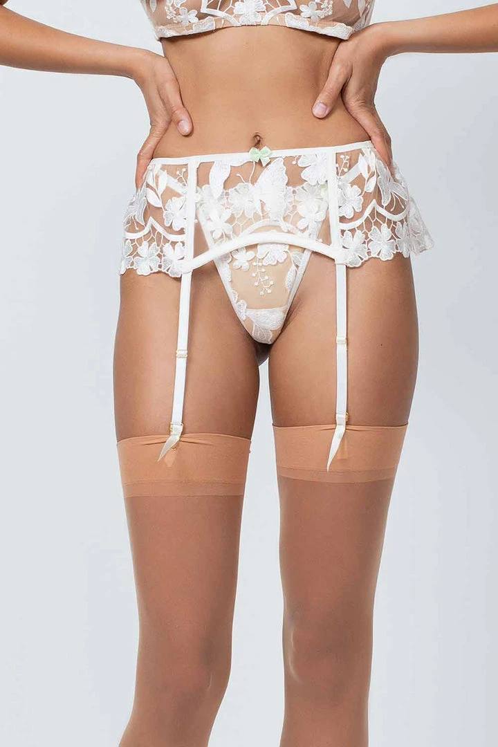 Kilo Brava embroidered suspender features a fully embroidered skirt, boning, adjustable straps, and an adjustable hook & eye closure. Contrast bow at center. Made with Kilo Brava’s exclusive, 2-tone hand-rendered butterfly embroidery,