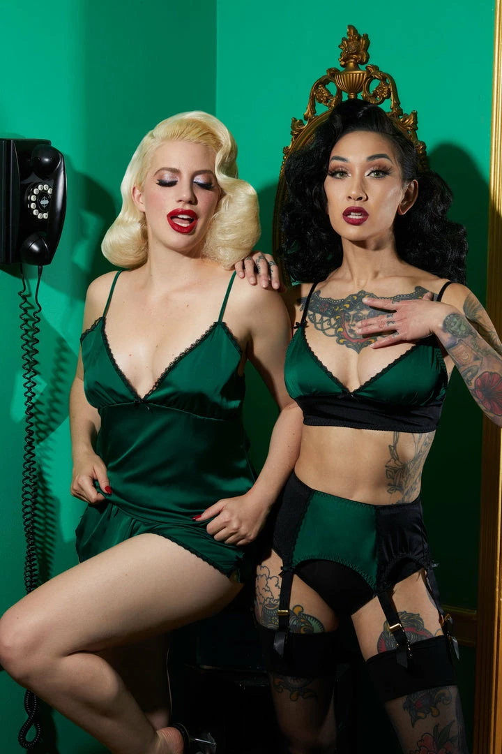 They’ll be green with envy when they see you in our Diana Green Camisole. Constructed from soft silky satin with a dainty black lace trim and bow. Match with our Diana Green French Knickers for the ultimate set.