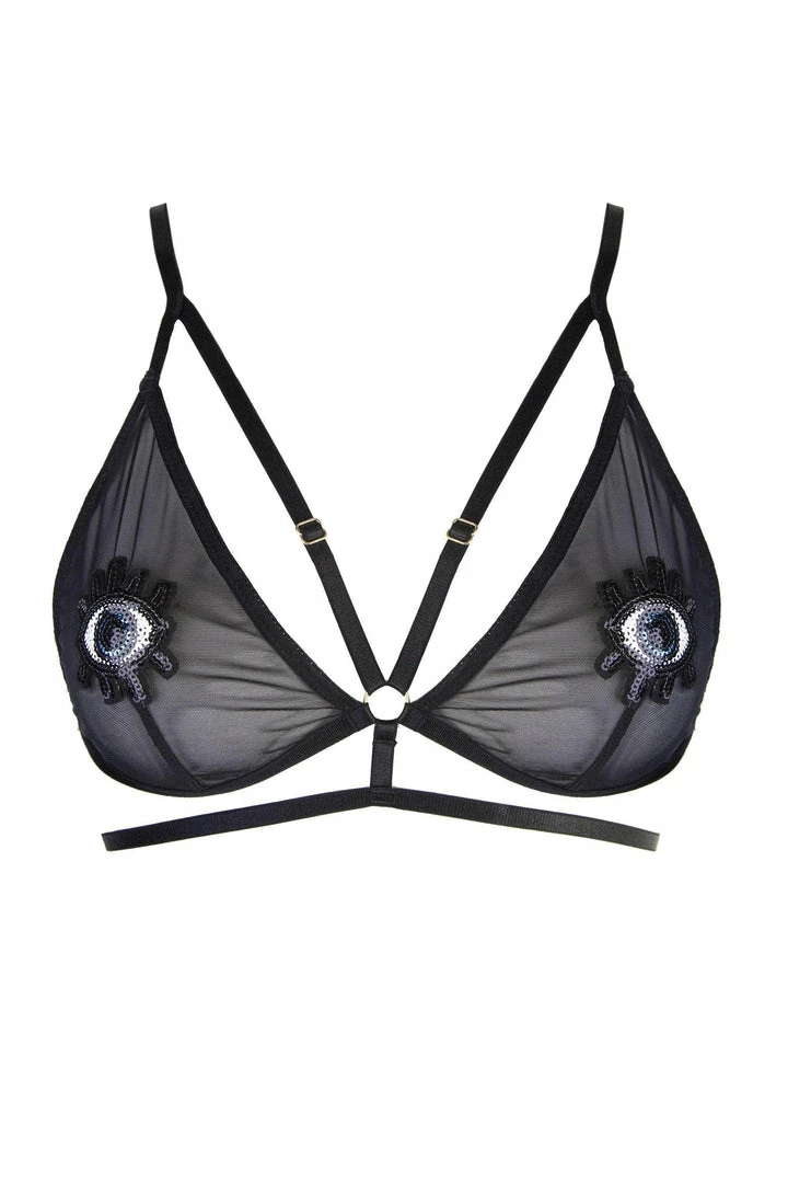 Want to add some Alice In Wonderland feels to your lingerie drawer? Look now further than our fun and playful Bridget bra. Bridget features sheer black mesh, a bralette cut, and a strap detail along the side of the cup and the underbust. The bra is embellished with a shiny sequin motif in the shape of an eye that is tantalisingly placed over the nipple area. Bridget fastens with two separate swan hook closures around the back.