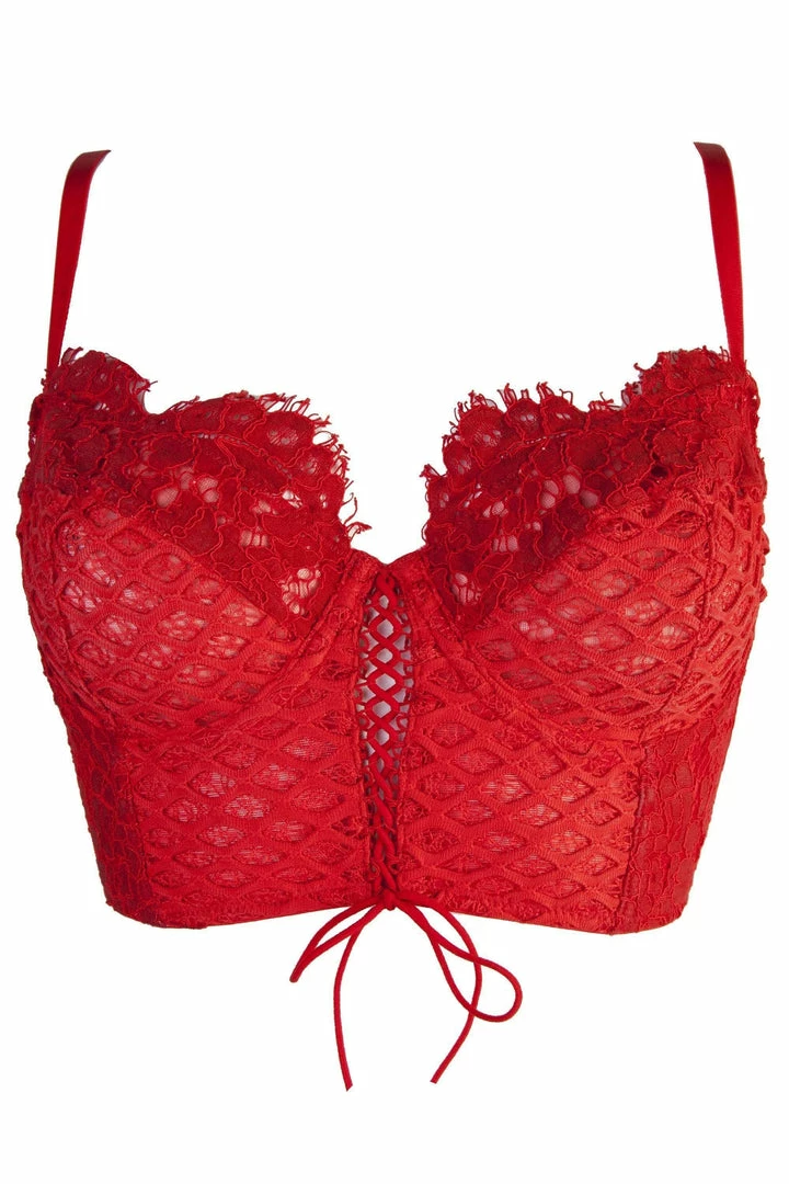 Stop the press – our hottest bra is in town! Whether you are digging the corded red lace, wide-gauge fishnet panels, or lace-up corset detail, our Toyen has it all. The bra features a longline shape, graphic mesh base, and floral lace trim along the cups. The bra fastens with a series of hooks and eyes at the back.