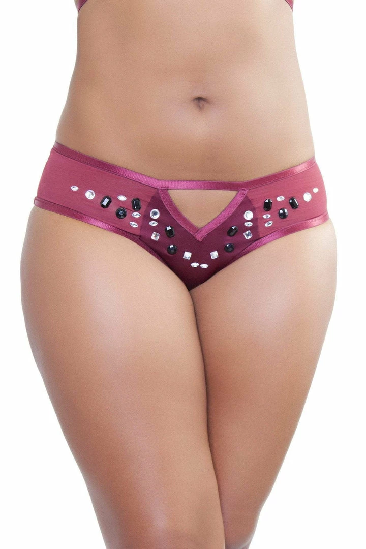 Trimmed with satin elastic, with a satin panel in the centre and matching mesh on the sides and back, the Betsy brief is an adorable, sparkly addition to your lingerie drawer! In the center is a flirtatious little cut-out, while the rest of the brief is embellished with silver and black gems.