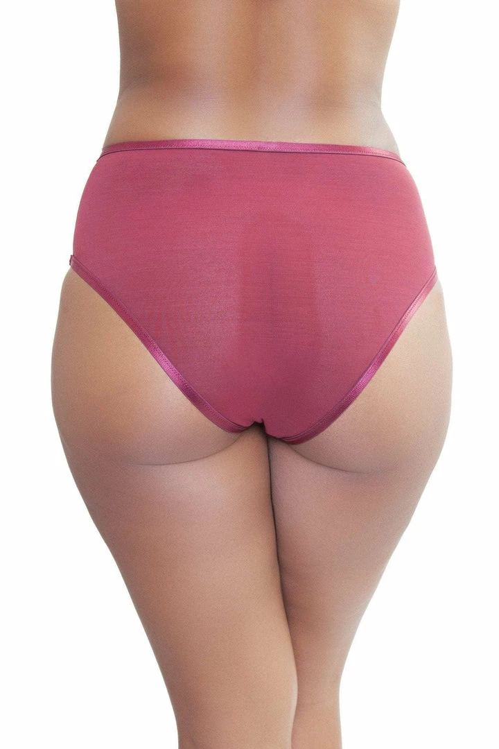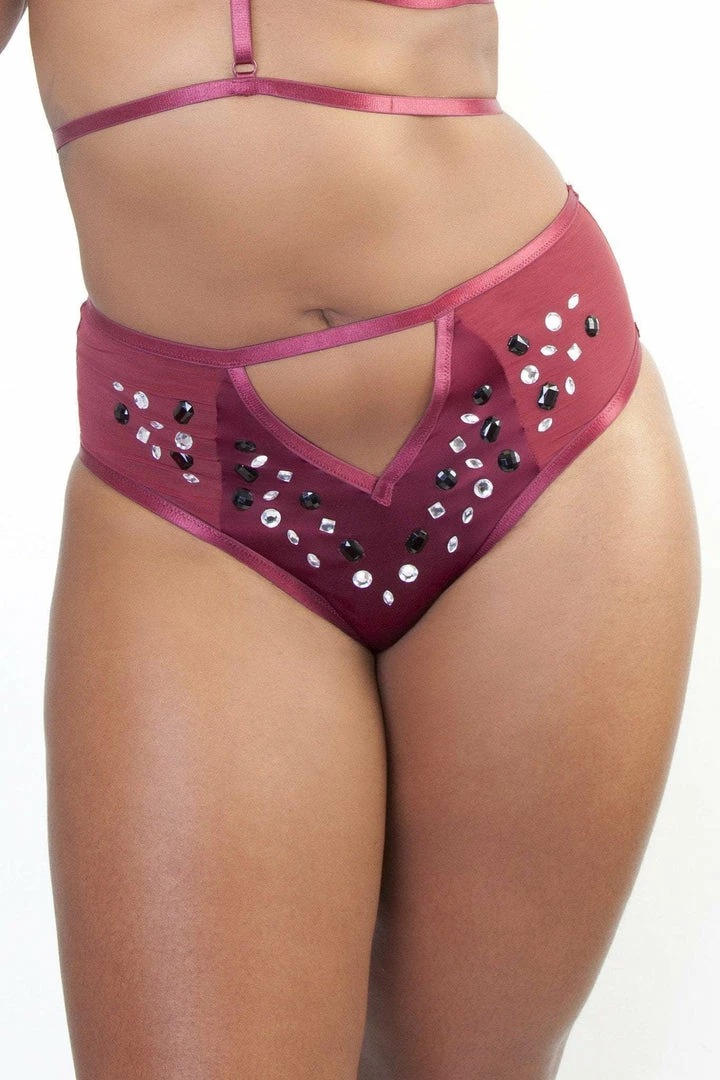Trimmed with satin elastic, with a satin panel in the centre and matching mesh on the sides and back, the Betsy high waist brief is an adorable, sparkly addition to your lingerie drawer! In the center is a flirtatious deep ‘v’ cut-out, while the rest of the brief is embellished with silver and black gems.