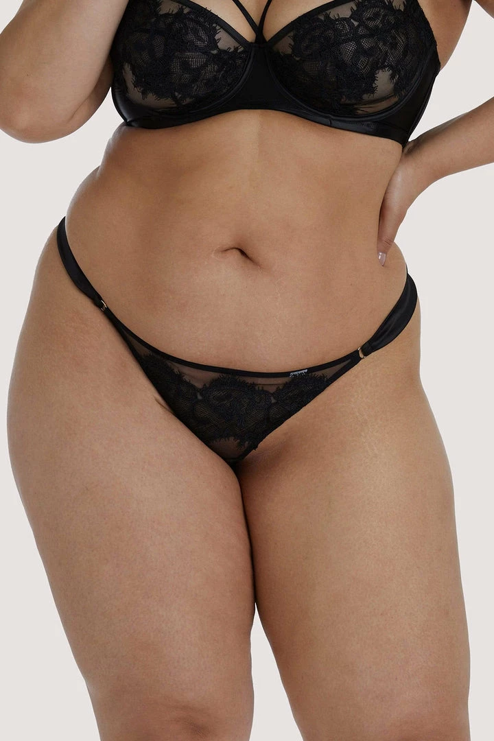 Va-va-voom! The Anneliese set features ravishing black lace and mesh. Satin straps adorn the hips on this luxurious brief, with a large bow at the back making you look like the gift you are!Â