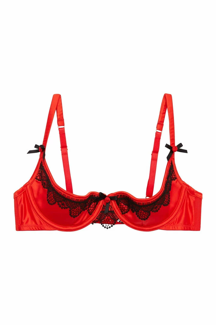 Naughty and seductive, the Arlene bra comes in classic red satin with quarter cups encased in lace; perfect for pairing with pasties, or nothing at all. The ever-so-slight padding creates a sensual lift and contour, and the design features a little black bow and red rose detail both in the centre and at each strap. The bra is finished with a delicate disc of lace falling below the bridge to create a scalloped edge effect.
