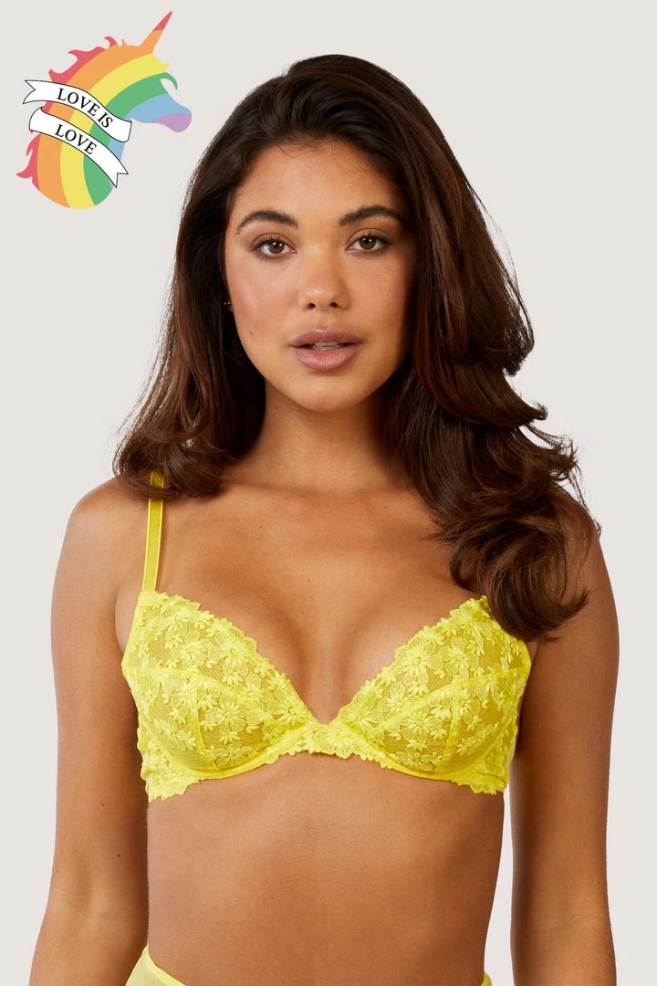 To celebrate Pride 2022, Playful Promises designed the ‘Love is Love’ capsule collection. We named the Pride lingerie collection after leading LGBTQ figures throughout history. This set is named after Audre Lorde, an American writer, feminist and civil rights activist, who dedicated her life and creative talent to addressing injustices racism, homophobia, sexism and classism. Featuring bright yellow floral embroidery on the cups with a soft mesh back and adjustable straps this is the perfect Bra to add a splash of colour this summer! Match with our Audre Suspender and Brief for the full look.