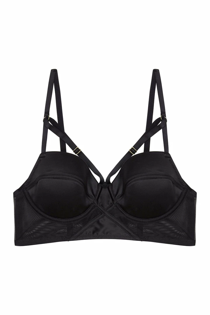 Become an unstoppable force of nature in the black crossover longline bra. With a bold criss-cross of mesh and satin on the cradle, padded underwired cups, and side boning to support the longline design, you’ll be feeling your power all day!
