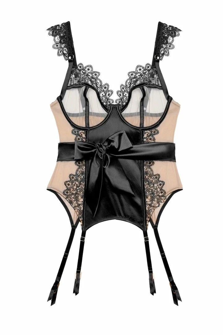 Make a stunning entrance in the Anaise basque featuring soft lace detailing and mesh panels to frame your cleavage. The black lace cascades down the front of the basque with a satin bow around the waist to accentuate your shape. Style with the matching lingerie for a set like no other.