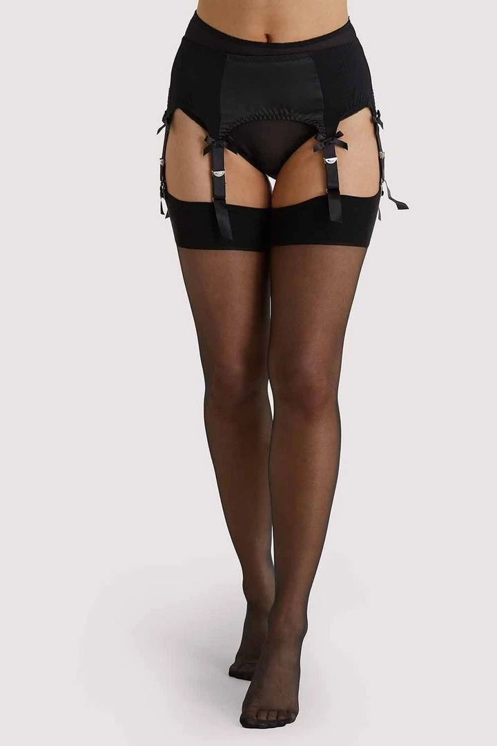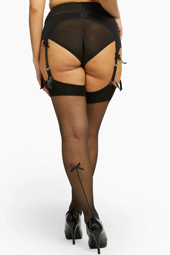 Simple from the front, but fun at the back. These sheer black stockings with bow and seam detail are unique, but subtle. Finish your look and set pulses racing.
