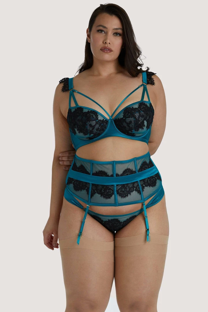 Strap in! The Anneliese set features ravishing Teal lace and mesh. The harness straps across the chest enhance your décolletage while the lace frills on the straps give this set an ultra-flirty look.