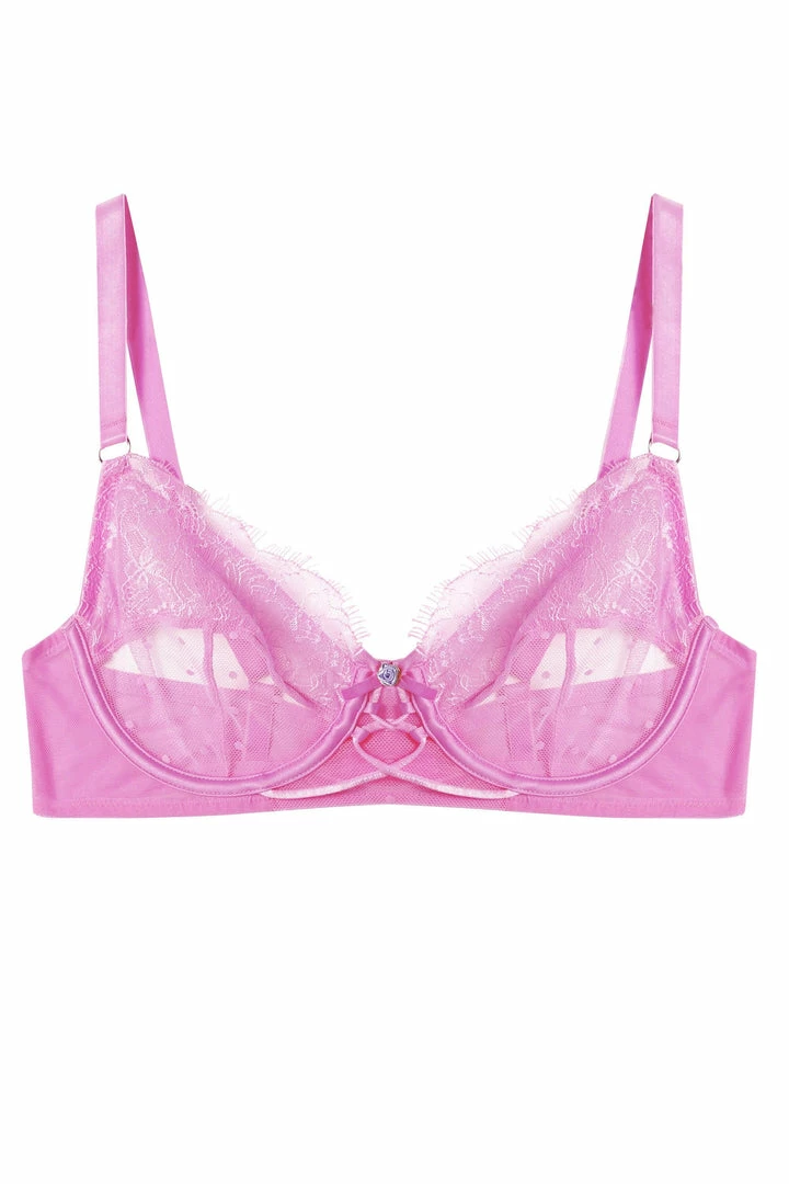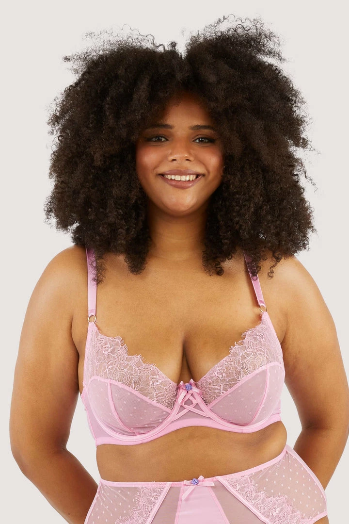 With her spotted mesh, lace edges and zig-zag bridge detailing, she makes herself known. She comes in a sweet candy pink colourway, and is finished with a satin pink and blue centre bow. She’s simply unmissable, a unique addition to your lingerie drawer…